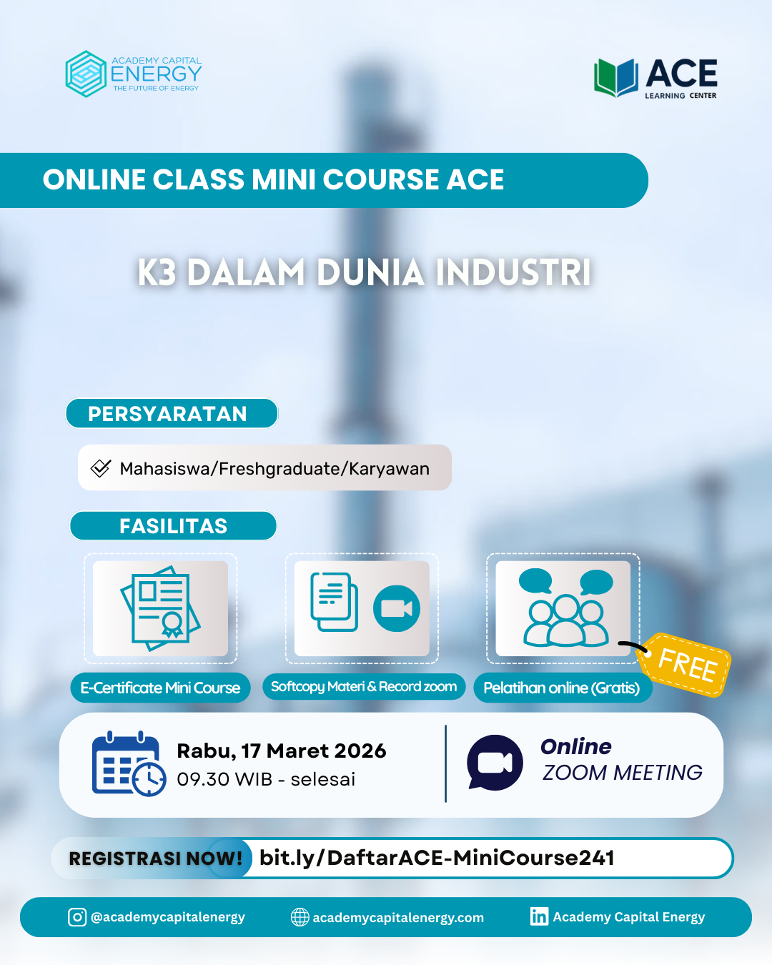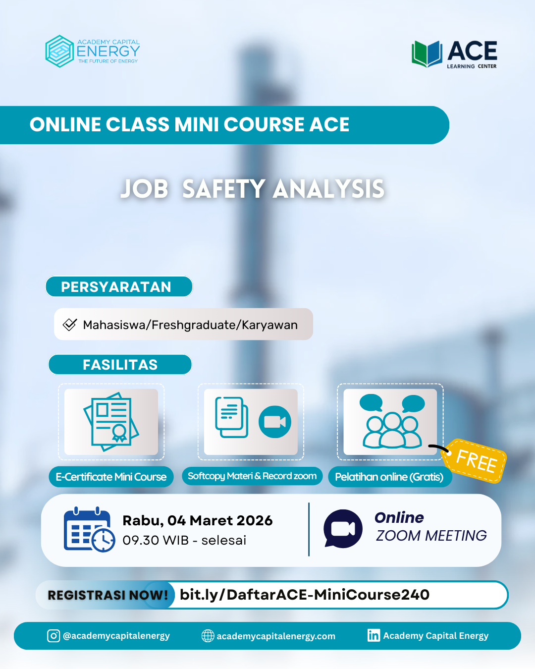 🚨 FREE WEBINAR ALERT! 🚨 Sobat ACE, siap upgrade skill kamu dengan cara yang cepat & praktis? 🔥 Ikuti Sobat Webinar ACE dengan tema: ✨ Demo: Membuat Poster Safety dalam 10 Menit dengan AI ✨ Di sesi ini, kamu akan belajar bagaimana membuat poster K3 yang menarik, profesional, dan cepat hanya dengan bantuan teknologi AI. Cocok banget buat kamu yang ingin lebih produktif dan kreatif di era digital! 💡 📅 Sabtu, 28 Maret 2026 ⏰ 10.30 WIB – selesai 💻 Via Zoom Meeting